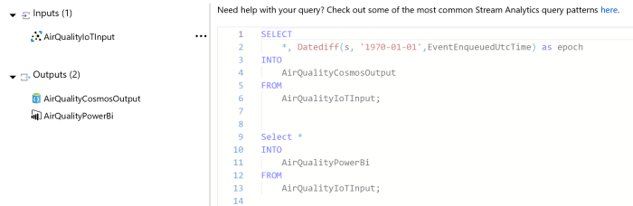 We can write our query to select from the defined inputs and write to the defined outputs.