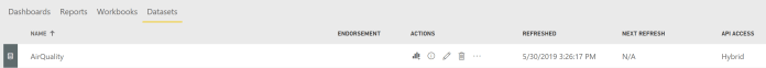 Stream Analytics will create and populate a new dataset in Power BI called AirQulity as IoT messages begin flowing in.