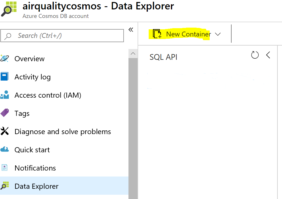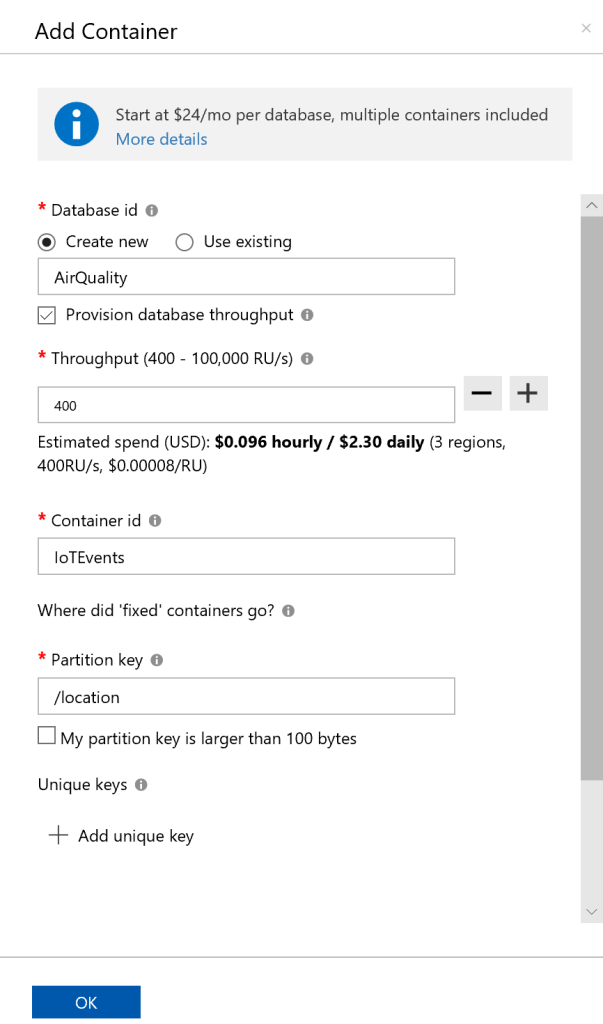 Create a database and container for the AirQuality messages. We can set the RU/s to 400 (learn more about Cosmos DB Request Units). Location would appear to be the logic partition choice given the message attributes.