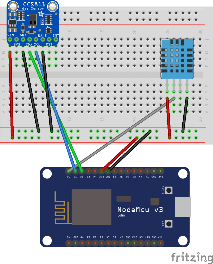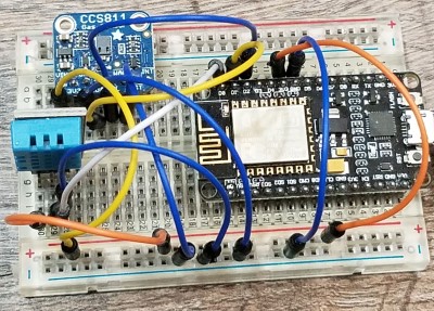 Similar to the Azure Event Hubs post, NodeMCU 8266 from HiLetgo was used to build the IoT devices. Their small form-factor, low cost and use of Arduino libraries make them the perfect fit for the project. The air quality monitoring device will measure temperature, humidity, CO2 and VOCs. (As a side note, I am not loving the CCS811 sensor after months of use and am open to any recommendations/comments).