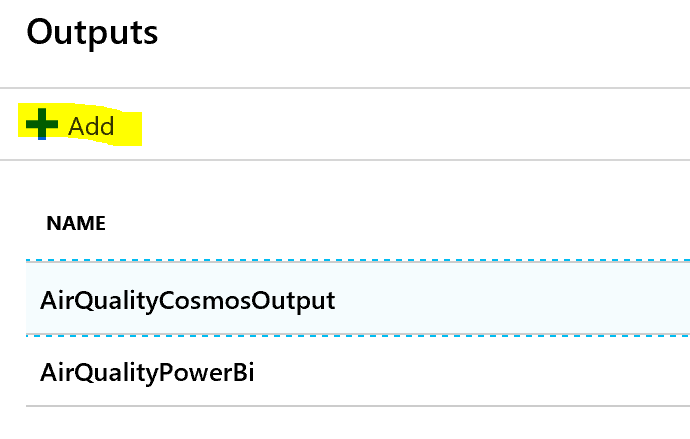 Click on Outputs (similar to adding inputs), click Add and add a Power BI output.