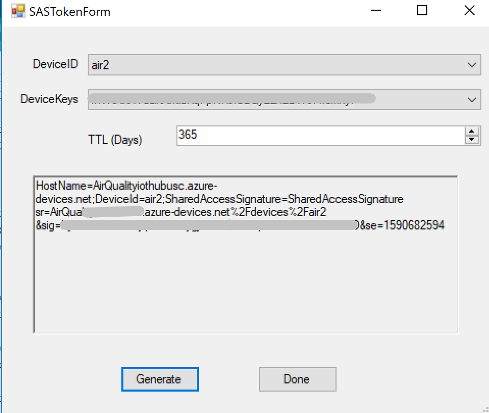 Click the SAS Token button for a device. Set the TTL (Days) and click Generate. Copy the generated SAS token as we will need it for our device to connect to IoT Hub.