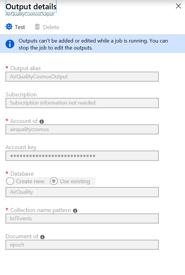 The Cosmos DB database and container settings created earlier in this post are required to configure the Output.