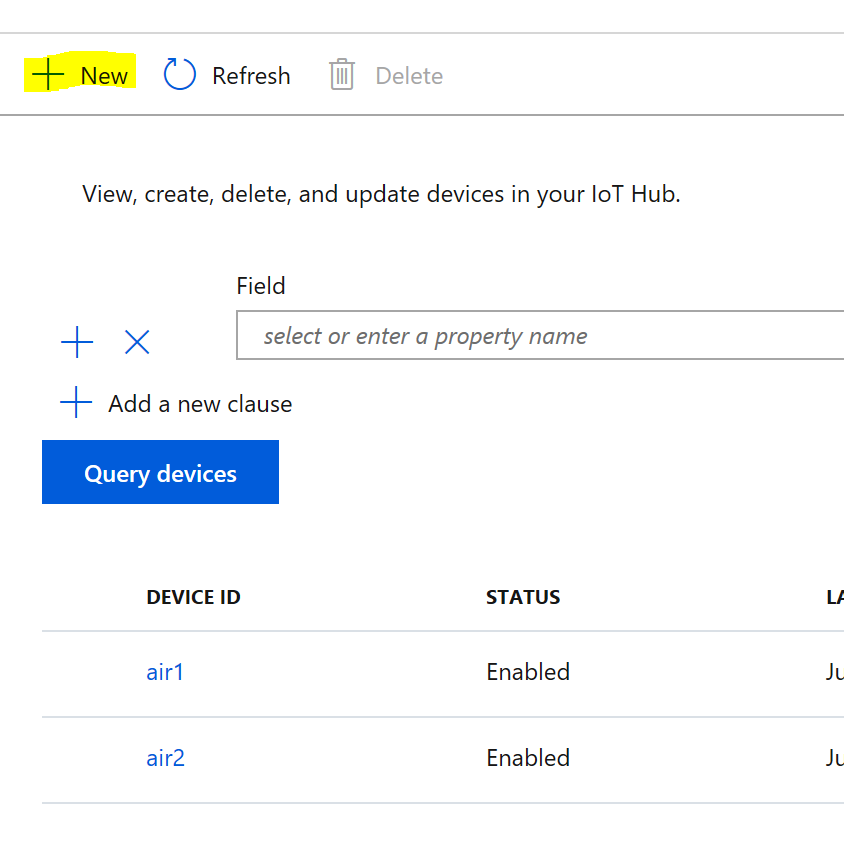 Add your devices when the IoT Hub Resouce is created by going to IoT devices. In this example I am using two devices to monitor air quality: air1 and air2. Click New to add your device.
