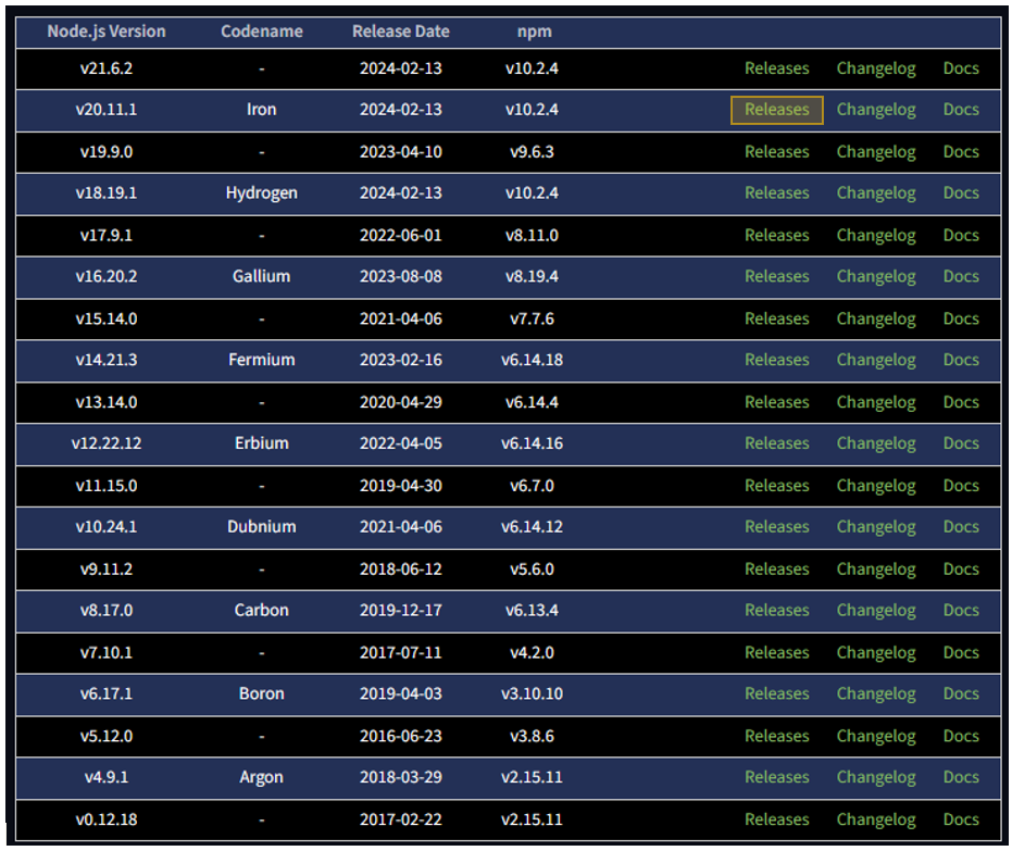 To run the React web application, Node.js is required. This project has been verified with the latest Long Term Support (LTS) version 20.11.1 at the time of this publication. Download and install Node.js to follow along with the code in this article. Head over to the Node.js download page and select ‘Previous Releases’.