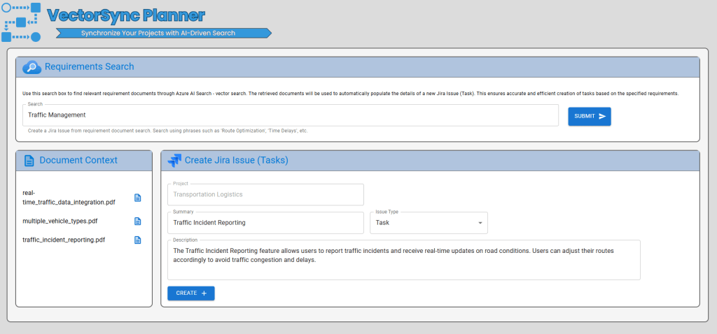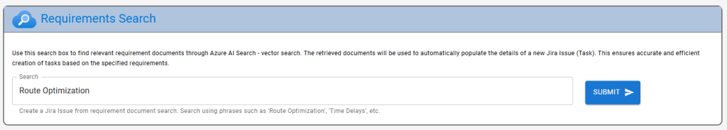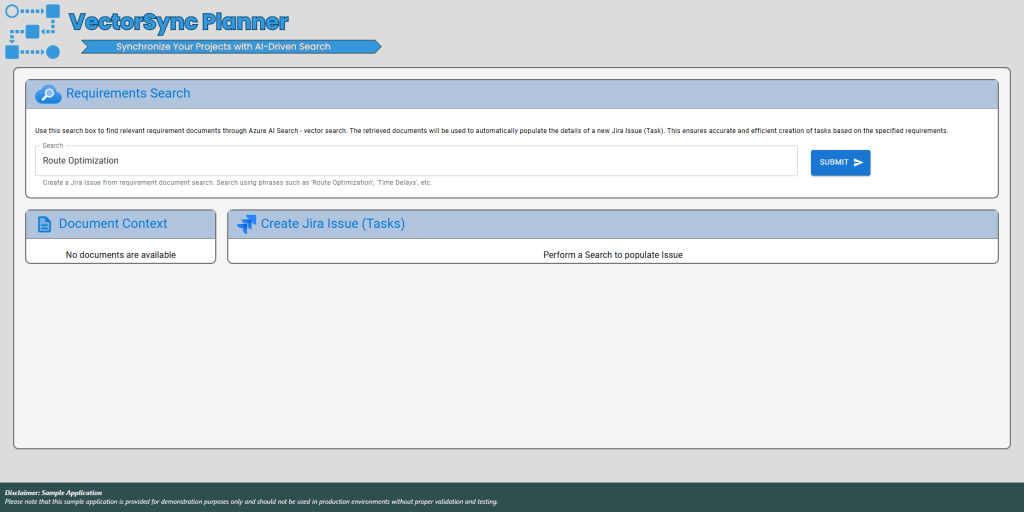 The front-end is crafted with React.js, delivering a user-friendly interface, while the back-end leverages Python FastAPI for robust and high-performance API management. The integration of Azure AI Search’s vector search and Azure OpenAI’s language models ensures that the application efficiently handles complex queries and provides valuable insights, streamlining the Jira issue management process and boosting overall operational efficiency.