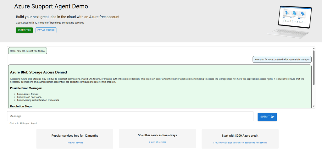 Once everything is set up, you can test the application by visiting the deployed web app (e.g., api-chatapi-demo-[random].azurewebsites.net) and submitting a query like “How do I fix Access Denied with Azure Blob Storage?”.