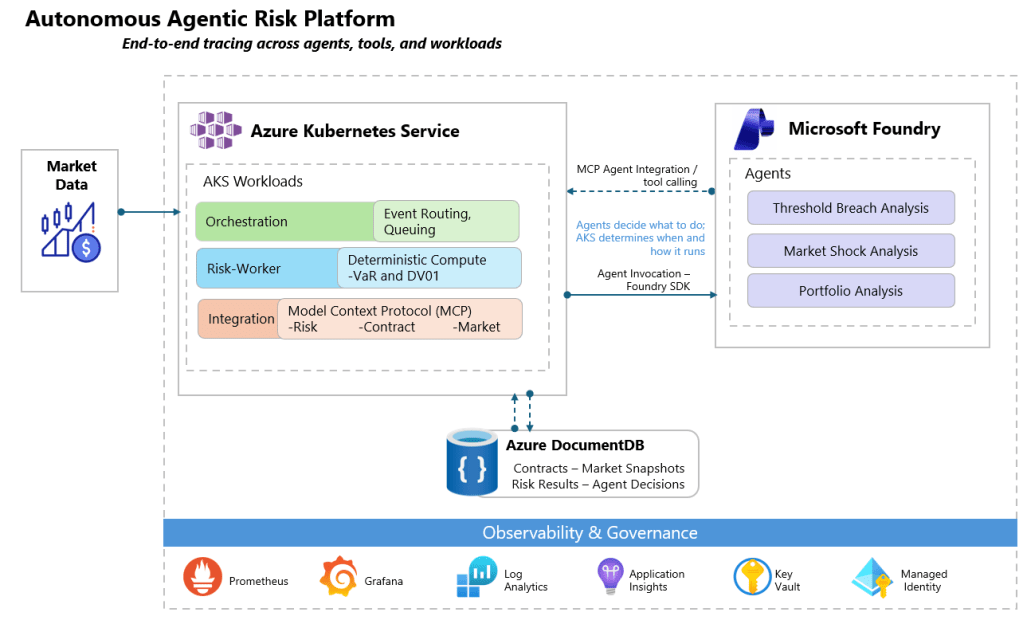 In this article, we walk through one such system: an always-on autonomous risk platform in which agents continuously evaluate contracts and market conditions, coordinate analysis through tools, and generate timely risk insights without direct human interaction. The platform brings together Azure Kubernetes Service, Microsoft Foundry, and Azure DocumentDB.