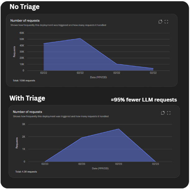 Microsoft Foundry provides the inference layer, model management, quota controls, and observability that made the impact measurable. The Foundry dashboard clearly showed the request volume drop from roughly 100K to 4.8K. Without that visibility, the value of triage would have been much harder to quantify.